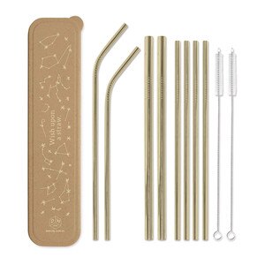 Designworks 8 Gold SS Straws, 2 Brushes, w/Plastic Travel Case, Wish Upon A Straw